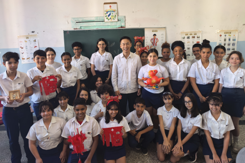 2026年2月12日,驻古巴大使华昕出席旅英侨胞董淑贞向罗德里格斯中学和巴尔德斯小学捐赠物资仪式,哈瓦那省政府国际司司长托伊米尔、哈瓦那省教育局总主任马雷罗、罗德里格斯中学校长卡梅霍、巴尔德斯小学校长巴克罗及近百名师生代表参加。