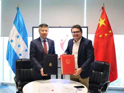2025年10月9日,驻洪都拉斯大使于波同洪社区发展、水和健康部部长奥乔亚共同签署特古西加尔巴会议中心和城市公园项目可行性研究工作现场考察会谈纪要。双方积极评价双边关系发展,表示将合力推进项目,造福两国人民。