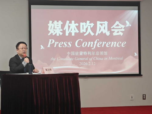 2026年2月12日,驻蒙特利尔总领事戴玉明举办媒体吹风会,介绍中加关系最新进展,宣介二十届四中全会精神和中国“十五五”规划,领区十余家媒体出席。