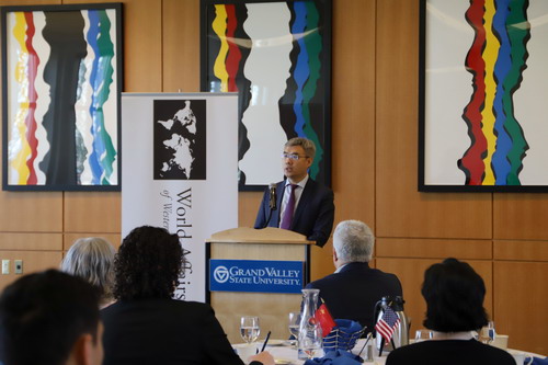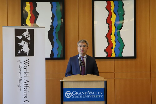 2024年4月16日,驻芝加哥总领事赵建出席西密歇根世界事务委员会举办的“与中国总领事对话”午餐会并发表主旨演讲。来自西密歇根地区50多位政商文教界代表参加。