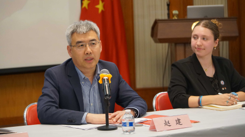 赵建总领事介绍了中国高质量发展情况及中美关系近况,指出中国人民坚持以中国式现代化推进民族复兴,同各国人民一道推动构建人类命运共同体。中美两个大国合则两利,斗则俱伤。双方应共同努力,把两国元首旧金山会晤达成的“愿景”变成“实景”。希望同学们积极参与中美交流,为增进双方的相互了解、友谊与合作作出贡献。赵建总领事还就中国经济、中国外交等回答了提问。总领馆青年外交官也同来宾进行了对话交流。