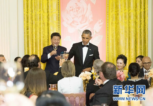 宴会开始后,奥巴马和习近平分别致祝酒辞。奥巴马在致辞中再次对习近平来访表示热烈欢迎。奥巴马表示,习近平主席和我在此次会谈中就继续加强两国各领域合作达成共识。美中不仅需要合作,也能保持合作,因为两国人民的长久友谊使我们充满信心。二战中中国村民营救美国飞行员,两国人民那时起就结下了兄弟般情谊。近年来双方民间旅游、留学越来越多,交往日益频繁。近期两国共同帮助非洲抗击埃博拉疫情,谱写了美中携手应对全球性挑战的佳话。两国民间友好持续发展,成为美中关系的一个重要支柱。我们要以海纳百川的精神,通过继续扩大合作,使美中两国更加强大。