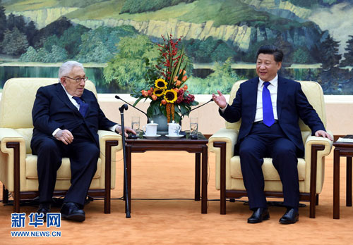 2015年11月2日,国家主席习近平在人民大会堂会见出席中美“二轨”高层对话第五次会议的美方主席、美国前国务卿基辛格,以及前国务卿舒尔茨、前财政部长鲁宾、前贸易代表希尔斯、前参议院军委会主席纳恩,前总统国家安全事务助理哈德利、多尼伦等美方代表。