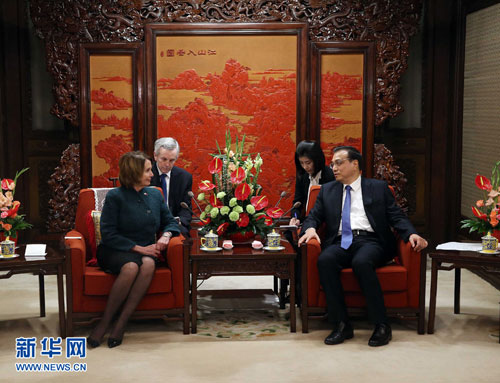 2015年11月13日下午,国务院总理李克强在中南海紫光阁会见美国国会众议院少数党领袖佩洛西率领的,包括多位联邦众议员参加的美国国会众议院访华代表团。