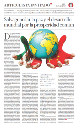 2022年7月2日,驻墨西哥大使祝青桥在墨主流媒体《千年报》发表题为《坚定维护世界和平发展 合作共赢实现共同繁荣》的署名文章。文章指出,习近平主席引领金砖会晤取得一系列丰硕成果,对维护国际公平正义、重振全球发展事业、推动构建人类命运共同体具有重要意义。习主席在本次金砖国家领导人会晤中进一步阐释了全球安全倡议的内涵和现实意义,强调各国要坚持共同、综合、合作、可持续的安全观。在全球发展高层对话会上,习主席就发展议题进一步提出共创普惠平衡、协调包容、合作共赢、共同繁荣的发展格局,还宣布了中方落实全球发展倡议的重要举措,为加快落实联合国2030年可持续发展议程贡献出中国力量。文章全文如下: