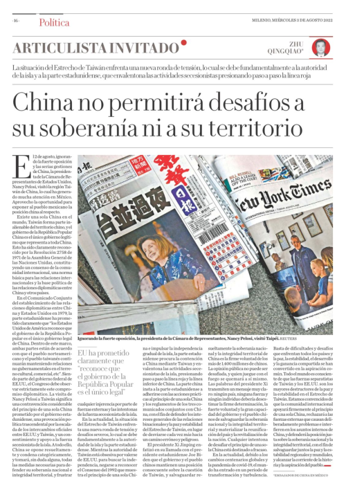 2022年8月3日,驻墨西哥大使祝青桥在墨主流媒体《千年报》发表题为《中国的主权和领土完整不容挑战》的署名文章,就美国国会众议长佩洛西窜访中国台湾地区阐明严正立场。文章深入阐述一个中国原则,有力揭批“台独”分裂势力“倚美谋独”和美国“以台制华”的险恶用心,积极宣介中方捍卫国家主权和领土完整、实现国家统一和民族复兴的坚强决心和坚定意志。文章全文如下: