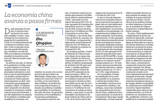 2022年9月8日,驻墨西哥大使祝青桥在墨主流媒体《金融学家报》发表题为《中国经济步伐稳健》的署名文章。文章指出,尽管今年年初中国疫情多发散发,对经济稳定运行造成了严重冲击,但自5月起,中国政府实施的稳增长政策措施显效,经济运行逐步企稳回升。目前全球经济滞胀风险在上升,但中国经济韧性强、潜力大,长期向好的基本特点没有变,中国经济将持续回升、向好发展,并推动世界经济稳定、平衡、包容、可持续增长。文章全文如下: