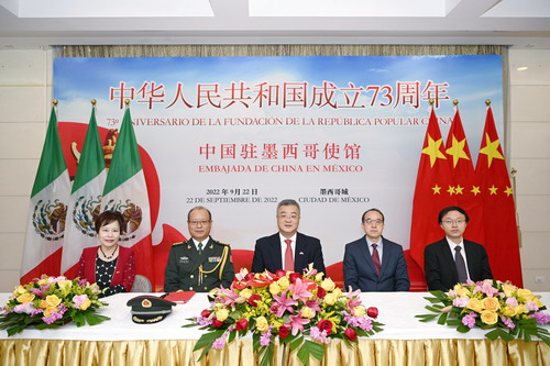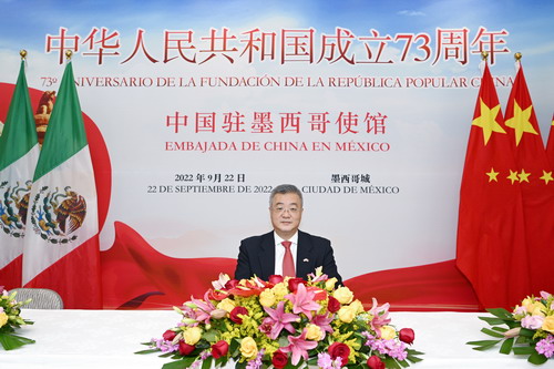 2022年9月22日,驻墨西哥大使祝青桥举办庆祝中华人民共和国成立73周年线上招待会。墨外交部代表亚太司司长冈萨雷斯、参议院书记纳罗、众议院墨中议会友好小组主席波列文斯基、陆军司令阿维拉、海军总参谋长巴蒂亚出席并发言,农业部副部长苏亚雷斯、瓦哈卡州长伊斯雷尔、金塔纳罗奥州长霍华金等墨政府、议会、政党、军方和地方领导,墨企业代表及各界友人,外国驻墨使节,中资企业、华侨华人、留学生等其他200余人出席。墨《金融家报》、《千年报》、《至上报》、《每日报》、特莱维萨电视台、阿兹特克电视台、电视22台、11台、6台等墨主流媒体也应邀出席。