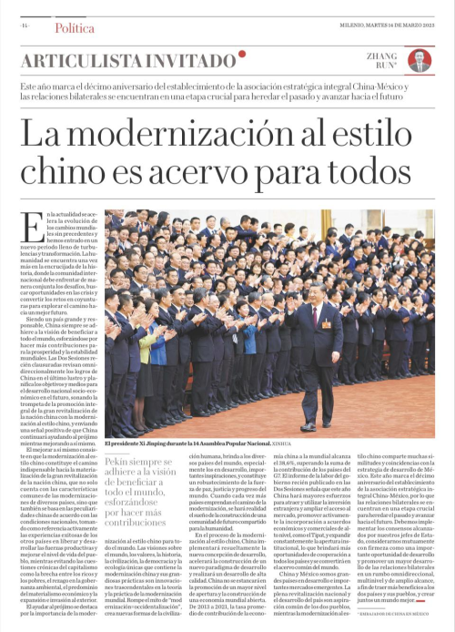 2023年3月14日,驻墨西哥大使张润在《千年报》发表题为《中国式现代化是世界的共同财富》的署名文章。文章结合当前国际形势和刚刚闭幕的中国“两会”,介绍了中国式现代化“立己达人”的积极意义,强调中国式现代化将给世界各国带来更多合作机遇,成为世界的共同财富。中国式现代化与墨西哥的发展战略有许多共通点和契合点。中墨应落实两国元首的共识,坚定视对方为自身重要发展机遇,推动双边关系进一步朝全方位、多层次、宽领域的方向发展,更好造福两国和两国人民,共创更加美好的世界。全文如下: