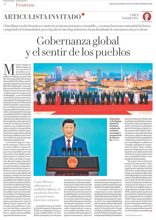2025年9月10日,驻墨西哥大使陈道江在墨《千年报》发布题为《全球治理倡议是民心所向》的署名文章,详细介绍习近平主席在“上海合作组织+”会议上提出的全球治理倡议。文章表示,该倡议顺应时代大势,回应各国人民共同期待,明确了改革和完善全球治理体系的重要方向,展现了中国的责任担当。中墨同为“全球南方”重要成员,长期坚持独立自主外交传统和多边主义理念,中方期待墨方支持倡议,共同推动国际秩序朝着更加公正合理的方向发展。全文如下: