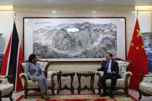 2023年1月9日,驻特立尼达和多巴哥大使方遒拜会来使馆出席第二届中特投资合作论坛的特多贸易和工业部长斯库恩,就双边关系和两国经贸务实合作等深入交换意见。