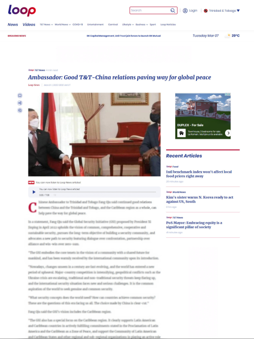 2023年3月1日,驻特立尼达和多巴哥大使方遒就《全球安全倡议概念文件》接受特多回路新闻网专访。