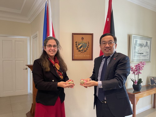 2023年3月17日,驻特立尼达和多巴哥大使方遒拜会新任驻特多使团长、古巴驻特多大使奥莱特,双方就中古关系和其他共同关心的问题交换意见。