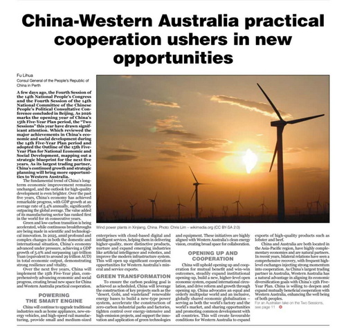 几天前,中国十四届全国人大四次会议和全国政协十四届四次会议在北京闭幕。2026年是中国“十五五”开局之年,这次两会尤为引人关注。会议总结“十四五”时期中国经济社会发展成就,审议通过《“十五五”规划纲要》,擘画未来五年发展蓝图。作为西澳州最大贸易伙伴,中国的发展将为西澳州带来更多新机遇。