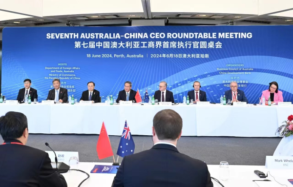 当地时间2024年6月18日上午,国务院总理李强在珀斯同澳大利亚总理阿尔巴尼斯共同出席第七届中澳工商界首席执行官圆桌会并致辞。约30位中澳商会和企业负责人出席。