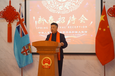 2018年2月12日,驻斐济使馆举行2018年中资企业和华侨华人新春招待会。在斐中资企业、旅斐华侨华人代表、南太平洋大学孔子学院及国家汉办公派斐济华文学校汉语教师等200多人应邀出席。