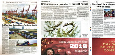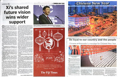 2018年2月16日农历大年初一,驻斐济使馆推动斐主流媒体《斐济太阳报》、《斐济时报》刊登中国春节特刊,庆祝中国农历狗年新春佳节。