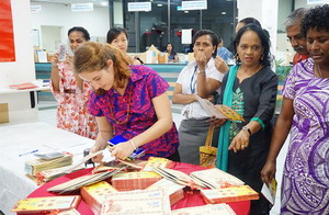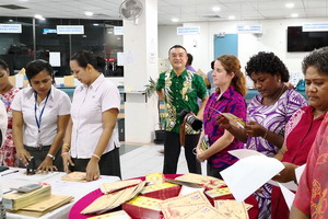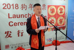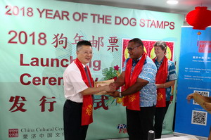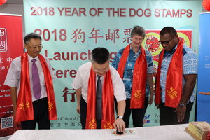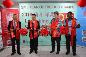 2018年3月2日元宵佳节,驻斐济大使钱波出席中国文化中心与斐济邮政公司共同举办的中国狗年生肖纪念邮票和首日封发行仪式,与斐教育部常秘伯切尔、斐济邮政公司代理首席执行官伊萨克莫欧、中国文化中心主任邓先富共同为邮票和首日封发行揭幕并加盖纪念邮戳。