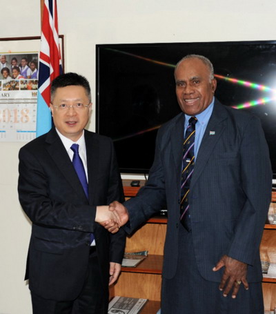 2018年3月8日,驻斐济大使钱波到任拜会斐济青年与体育部长莱塞尼亚·图伊通鲍。
