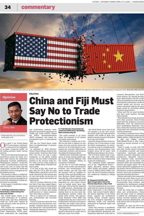 2025年4月11日和12日,驻斐济大使周剑在斐济主流报纸《斐济时报》和《斐济太阳报》发表题为《中斐要对贸易保护主义说不》的署名文章。全文如下: