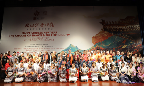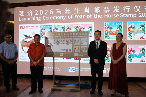 随后,汪元代办同辛格部长共同为马年生肖邮票揭幕,观看中斐文旅影像展览,并欣赏山西省文艺团同斐济艺术家联袂奉上的精彩表演。