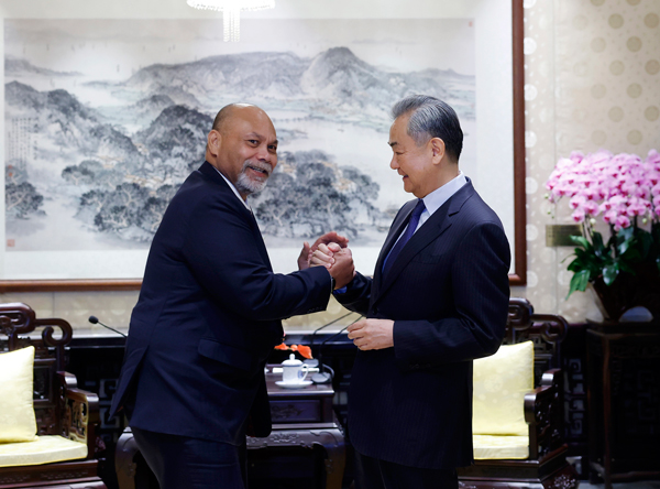 2025年3月26日,中共中央政治局委员、外交部长王毅在京会见专程来华出席瑙鲁驻华使馆开馆仪式的瑙鲁外长安格明。