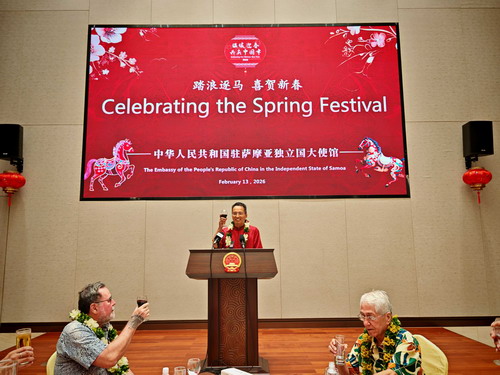 2026年2月13日,驻萨摩亚大使费明星出席“踏浪逐马 喜贺新春”2026马年新春招待会,副元首勒·劳鲁、副总理托埃卢佩等120人出席。