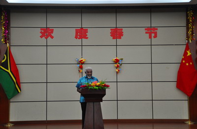 代总理纳图曼在致辞中代表瓦政府和人民向中国政府和人民致以美好的节日祝愿。纳说,非常荣幸能够出席大使馆举办的新春招待会。中国春节历史悠久,在全球都有很大影响。瓦努阿图文化与习俗同中国也有许多相似之处,这拉近了我们彼此之间的感情。纳感谢中方对瓦无私援助,强调在中方帮助下,瓦经济社会发展取得了很大成就,给瓦努阿图人民带来了实实在在的利益,希望两国继续深化各领域交流合作,推动瓦中友谊再上新台阶。