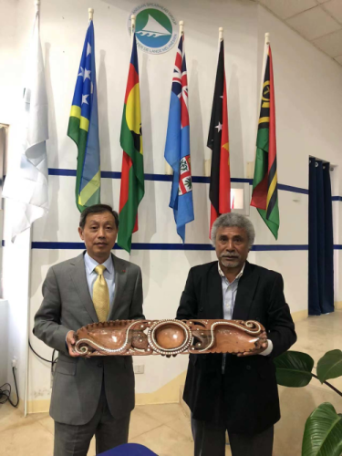 2022年10月25日,驻瓦努阿图大使李名刚会见美拉尼西亚先锋集团(MSG)总干事洛马。