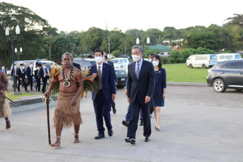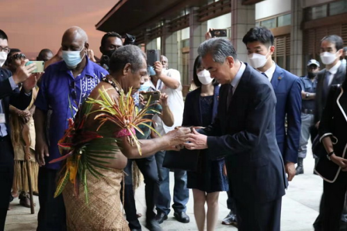 2022年6月1日,时任国务委员兼外长王毅同志访问瓦努阿图,成为新冠疫情以来第一位访瓦的外国领导人。在中国援建的瓦国家会议中心门口,瓦全国酋长委员会主席帕拉苏瓦作为全国大酋长主持传统仪式,以最高规格欢迎王毅同志。会谈结束后,帕拉苏瓦主席亲自为王毅同志递上瓦努阿图的“国饮”卡瓦。双方共同举杯,畅叙友好,为一天的活动画上圆满句号。