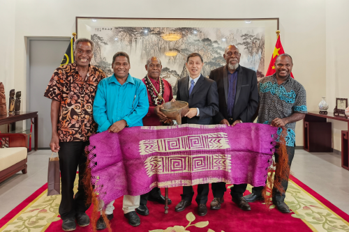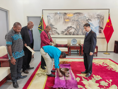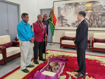 来瓦履新后不久,我有幸当面向帕拉苏瓦主席转达王毅同志的亲切问候。回想起那次访问,主席先生仍记忆犹新:“作为全国大酋长,我十分荣幸参与接待王毅阁下。中国一直是瓦努阿图的好朋友,是最早支持我们反对殖民统治、争取民族独立的国家。瓦独立后,中方继续像家人一样无私帮助建设急需的基础设施、派遣医疗队等,造福当地民众。这些善举义举,我们都铭记在心。”我从大酋长口中了解到,包括他自己在内的很多酋长都未曾去过中国,一直期待有朝一日能亲身感受中国的社会发展与传统文化。打那时起,我下定决心,一定要让这位中国人民的朋友带上各地酋长去中国走一走、看一看。