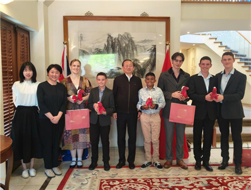 2025年12月14日,驻奥克兰总领事陈世杰在官邸会见“汉语桥”比赛获奖选手代表奥克兰大学艾拉,塞尔温中学伽勒、泰勒,雷木依拉中学卢克及阿拉荷小学亚当。