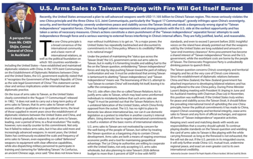 2026年1月9日,驻奥克兰总领事陈世杰在《新西兰先驱报》发表署名文章《美国对台军售如同“抱薪玩火”》。