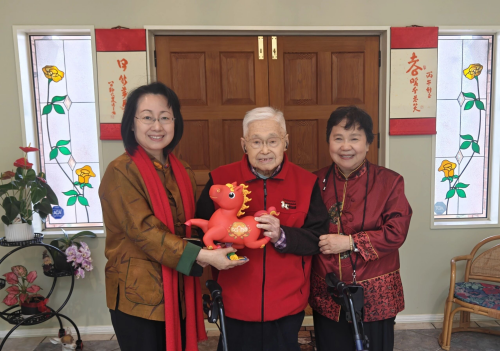 何颖总领事向汤老夫妇赠送了象征吉祥的马年玩偶,祝愿二老在新的一年里福寿安康。汤老身着红装,精神矍铄,与何总领事一行互致新春问候,并兴致勃勃地展示了自己最新创作的春联。红纸墨香之间,不仅流淌着中华传统文化的深厚底蕴,更饱含着一位百岁长者对家国的深情与眷恋。