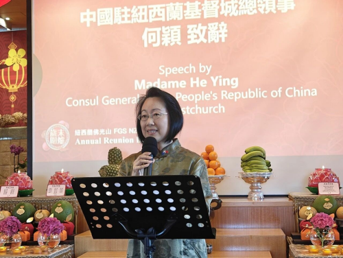 2026年2月14日,驻克赖斯特彻奇总领事何颖应邀出席南岛佛光山春节围炉晚宴活动。新西兰佛光山住持满信法师、觉西法师及各界代表近百人参加。
