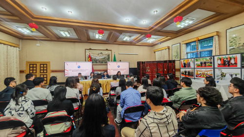 2025年11月5日,驻阿尔及利亚使馆举办公派留学生座谈会暨领事保护与协助宣讲会,驻阿尔及利亚使馆临时代办赵平盛与30余位公派留学生座谈交流。