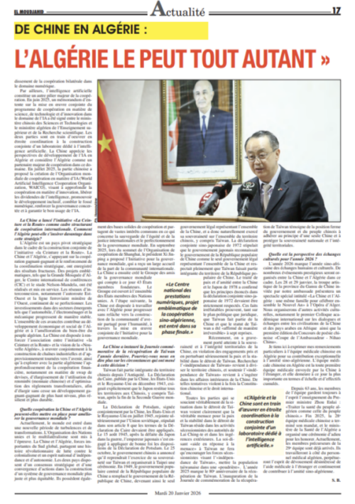 2026年1月15日,驻阿尔及利亚大使董广利接受阿法文官方媒体《圣战者报》采访,重点解读《习近平谈治国理政》第五卷核心思想和重要意义,详细阐释台湾问题来龙去脉、零关税政策对非利好、全球治理倡议、世界人工智能合作组织,介绍中阿经贸务实合作和人文交流成果,并就相关国家涉台错误行径等问题阐明中方严正立场。采访于2026年1月20日在该报刊发,实录如下: