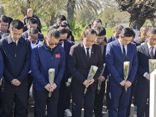 2026年4月5日,驻阿尔及利亚大使董广利率使馆全体馆员、中资企业协会会长单位中建阿尔及利亚公司及协会会员企业负责人、中国援阿医疗队、华侨华人代表等100余人赴阿尔及尔阿利亚国家公墓举行祭扫活动。