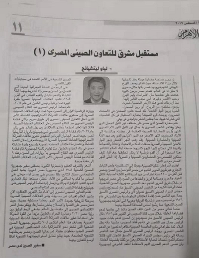 2019年8月12日和14日,驻埃及大使廖力强在埃第一大报《金字塔报》显著版面发表题为《文明古国的现代牵手,中埃合作前景光明——写在抵达埃及履新之际》的署名文章(上、下篇)。文章全文如下: