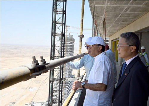 杨易总领事陪同马德布利总理登上阿拉曼新城超高综合体项目D01标段第51层楼,俯瞰新城全貌,并参观项目样板间,了解项目履约进展、设计理念和质量管控成效。