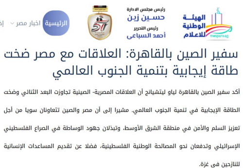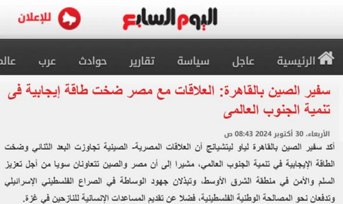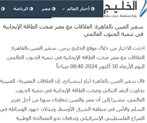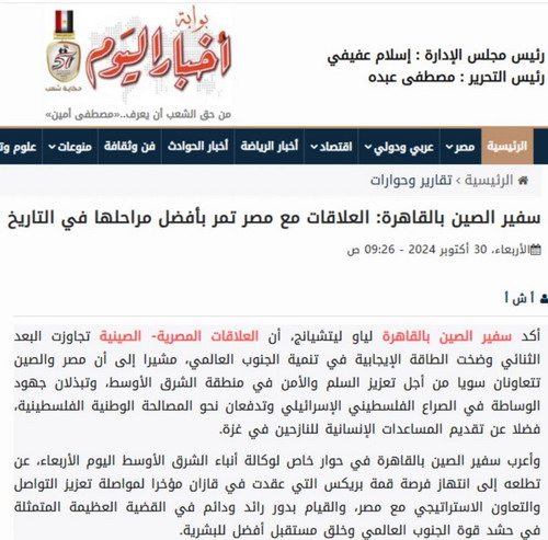 10月下旬,习近平主席出席金砖国家领导人第十六次会晤取得圆满成功。2024年10月30日,驻埃及大使廖力强接受埃及国家通讯社中东社专访,介绍此访成果。埃及国家新闻局官网以及《消息报》、《七日报》、海湾网等多家媒体转发采访内容。采访实录如下: