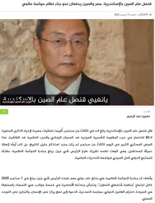 2025年9月13日,《共和国报》《鲁兹优素福》《晚报》《今日埃及》等20多家埃及主流媒体刊登驻亚历山大总领事杨易署名文章《全球治理倡议:构建更加公正合理的全球治理体系》,宣介全球治理倡议,全文如下: