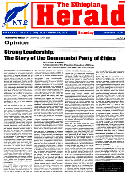 2021年5月22日,驻埃塞俄比亚大使赵志远在《埃塞先驱报》发表题为《领袖引领——中国共产党的故事》的署名文章,生动讲述中国共产党在领袖的引领下,始终不忘初心使命,坚持为人民谋幸福、为民族谋复兴、为世界谋大同的伟大事业。全文如下:
