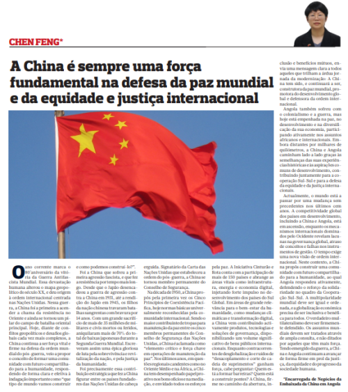 2025年9月3日,驻安哥拉使馆临时代办陈凤在安《国家报》发表署名文章《中国始终是维护世界和平与国际公平正义的中坚力量》,全文如下: