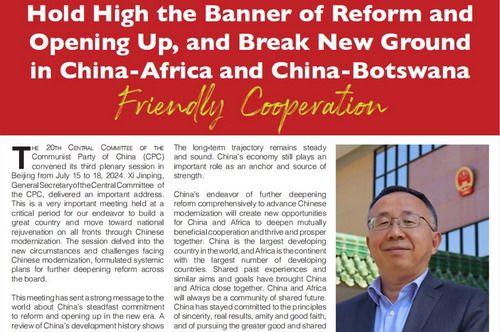 2024年8月11日,驻博茨瓦纳大使范勇在博主流媒体《爱国者报》发表题为《高举改革开放旗帜 努力开创中非和中博友好合作新局面》的署名文章,宣介党的二十届三中全会精神以及中国全面深化改革、推进中国式现代化对于促进中非互利合作、中博友好合作的重要意义,全文如下: