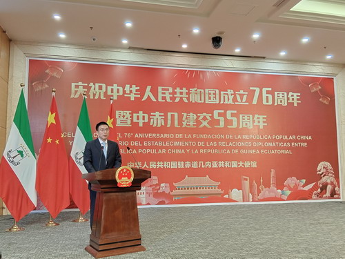 2025年9月23日,驻赤道几内亚使馆举行国庆76周年暨中赤几建交55周年招待会。驻赤道几内亚使馆临时代办姜涵,赤几外交部常务副部长翁多、国防部副部长恩戈莫、执政党民主党第一副总书记埃拉等官员及各界友好人士,驻赤几外交使团,援赤几专家组、中资机构和华侨华人代表等350余人出席。