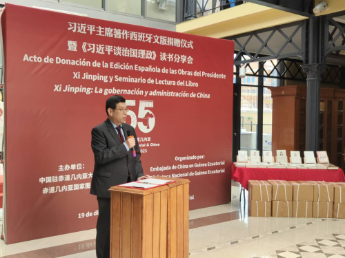 2025年12月19日,驻赤道几内亚大使王文刚出席使馆与赤几国家图书馆联合举办的习近平主席著作西班牙文版捐赠仪式暨《习近平谈治国理政》读书分享会。赤几新闻部文化中心、图书馆与图片司司长姆巴,国家图书馆馆长埃科佩莱及当地读者共50余人出席。