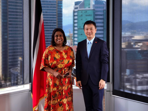 2024年11月15日,驻特立尼达和多巴哥使馆临时代办杨晗拜会特多贸工部长斯库恩,贸工部常秘卡里姆等在座。