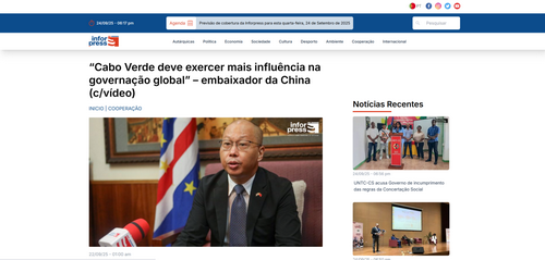2025年9月22日,佛得角国家通讯社在官方网站及社交媒体平台发布对张洋大使专访。驻佛得角大使张洋全面宣介全球治理倡议,阐释中佛战略伙伴关系重要意义和未来发展前景,在佛引发积极反响。