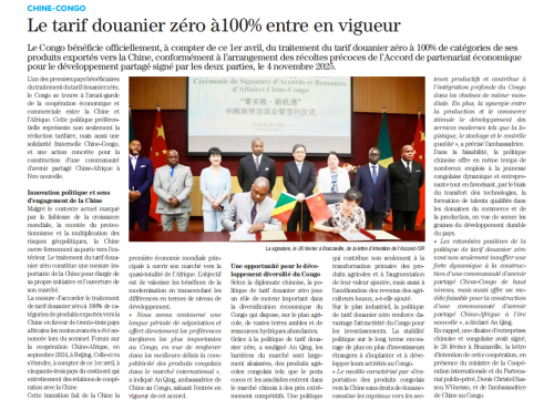 2025年11月4日,中国与刚果(布)签署《关于共同发展经济伙伴关系协定早期收获的安排》,刚将从2026年4月1日起正式享受对华出口100%税目产品零关税。